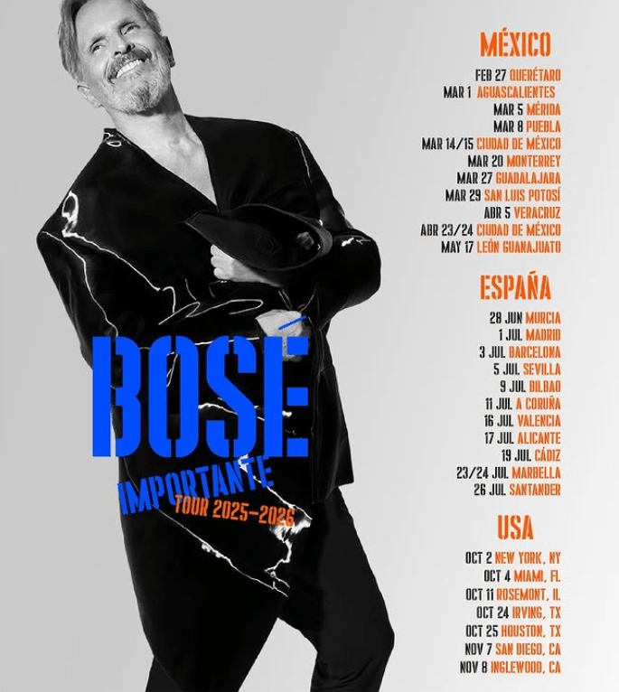 Miguel Bosé se prepara para regresar a los escenarios con su Importante Tour 2025-2026, una gira mundial que marca su retorno tras ocho años de ausencia. El recorrido comenzará el 27 de febrero en Querétaro, México, y continuará por España, Estados Unidos y otros países de Latinoamérica.