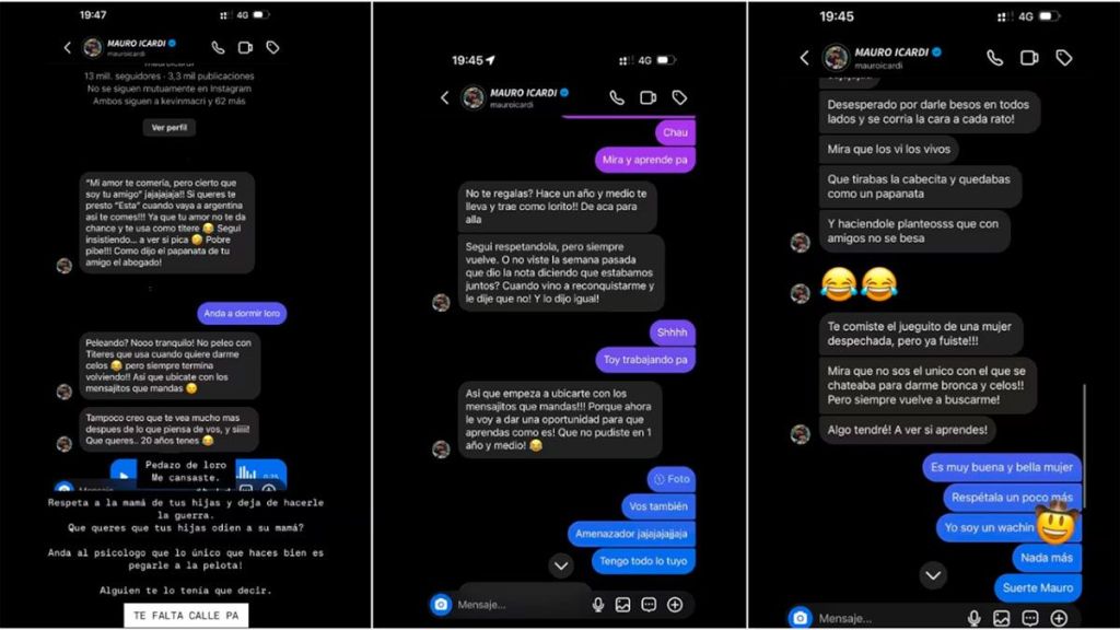 Todo empezó cuando L-Gante, aún convaleciente, decidió ventilar mensajes privados que Icardi le mandó antes de que Wanda confirmara su romance con él y de que el jugador del Galatasaray se enredara con China Suárez. “Mi amor, te comería, pero cierto que soy tu amigo. Si querés te presto ‘esta’ cuando vaya a Argentina”, escribió Icardi, burlándose de un vivo que el cantante hizo con Nara. “Andá a dormir, loro”, respondió L-Gante, pero el futbolista no paró: “No peleo con un títere que usa para darme celos. Siempre vuelve a buscarme”. La tensión subió cuando Icardi lo llamó “papanata” y lo acusó de caer en el juego de “una mujer despechada”.