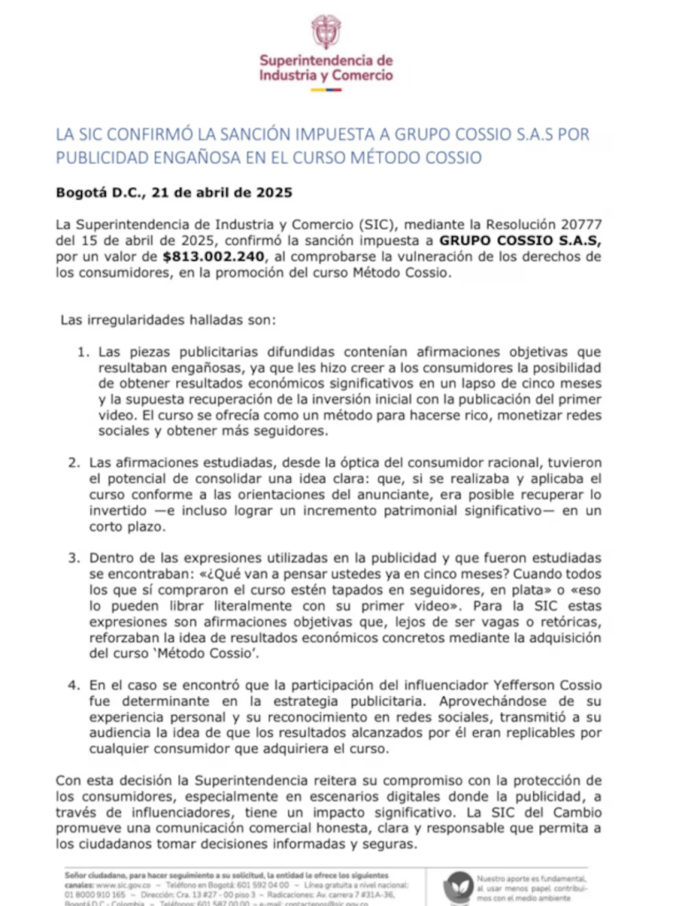El organismo también destacó el uso de la imagen y trayectoria de Cossio como parte de la estrategia. El influencer, conocido por su ascenso meteórico en redes sociales, presentó su éxito personal como un resultado fácilmente replicable para cualquiera que adquiriera el curso. Esta táctica, según la SIC, llevó a los consumidores a tener expectativas desproporcionadas sobre su potencial financiero.