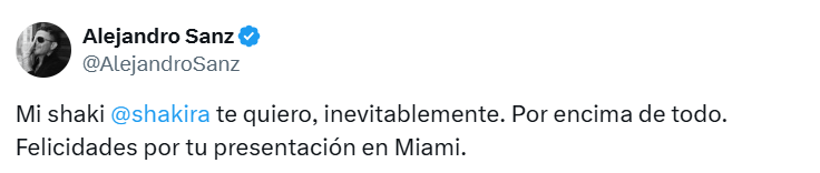 Sanz, visiblemente emocionado, respondió en X: “Mi Shaki, te quiero, inevitablemente. Por encima de todo. Felicidades por tu presentación en Miami. Existen noches que el universo repite a propósito”. Este intercambio avivó aún más los rumores, especialmente tras la reciente separación de Sanz de su pareja, Candela Márquez, quien dejó de seguirlo en redes.