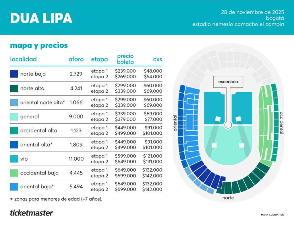 La boletería para el concierto en Bogotá conserva localidades limitadas, con precios que van desde $239.000 hasta $699.000, dependiendo de la ubicación en el estadio. En plataformas como Ticketmaster aún se encuentran algunas entradas disponibles en zonas específicas, mientras que la mayoría ya registran agotado.