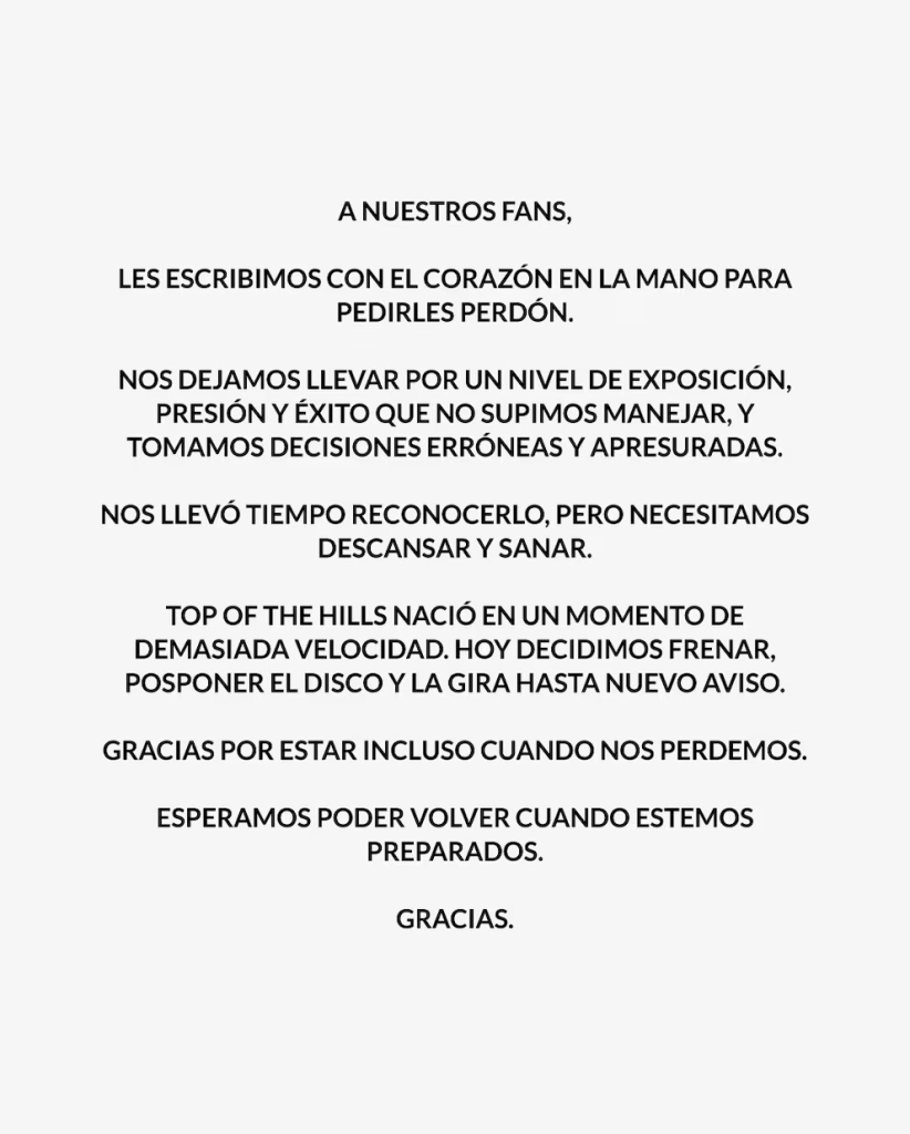El dúo argentino anunció la suspensión indefinida del lanzamiento de su álbum «Top of the Hills» y de su próxima gira, argumentando agotamiento y dificultades para gestionar la alta exposición mediática.