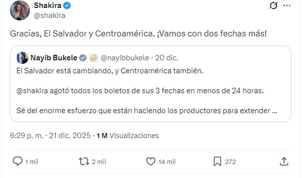 Poco después, Shakira respondió confirmando la ampliación del calendario: «¡Vamos con dos fechas más!», anunció la barranquillera, consolidando al Estadio Nacional Jorge ‘Mágico’ González como la sede oficial de esta residencia regional.