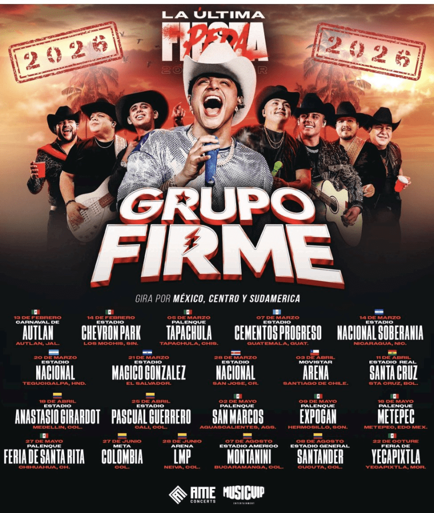 La agrupación mexicana Grupo Firme confirmó su regreso a Colombia para 2026 con la gira La Última Peda. El tour visitará Medellín, Cali y Bucaramanga, entre otras ciudades, ampliando su alcance nacional tras agotar entradas en Bogotá.
