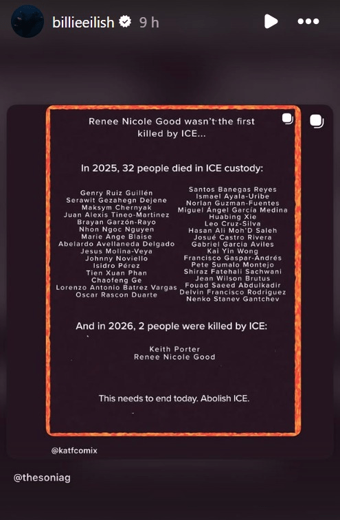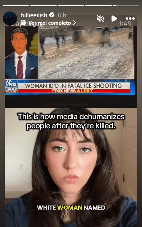 Los mensajes fueron difundidos el viernes 9 de enero, dos días después de que Renee Nicole Good, de 37 años, muriera tras recibir disparos de un agente de ICE durante una operación de control migratorio en Minneapolis. A través de sus historias de Instagram, Eilish replicó un gráfico que califica a ICE como un “grupo terrorista financiado y apoyado federalmente”, señalando que la agencia “destruye familias, aterroriza a ciudadanos y asesina a personas inocentes”.