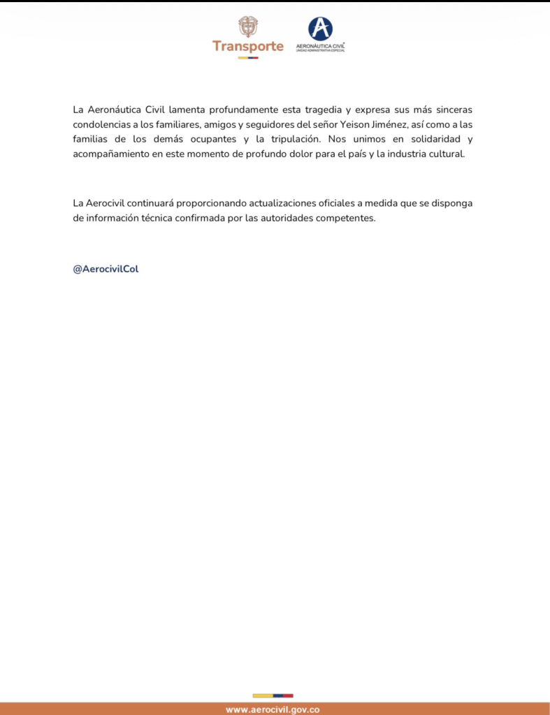 El cantante colombiano de música popular Yeison Jiménez murió este pasado 10 de enero tras un accidente aéreo ocurrido minutos después de despegar del aeropuerto de Paipa, Boyacá. El artista viajaba hacia Medellín, donde tenía programada una presentación esa misma noche.