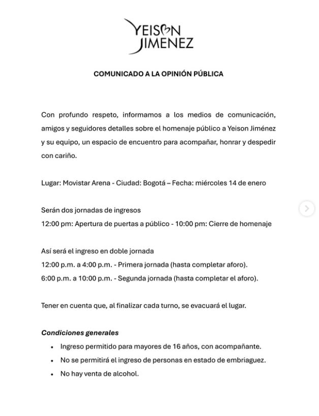 Bogotá realizará este miércoles 14 de enero un homenaje público a Yeison Jiménez en el Movistar Arena. El acto será de acceso gratuito y contará con la participación de familiares, amigos y artistas del género popular, en una jornada organizada en dos bloques para permitir la asistencia ordenada de los seguidores.