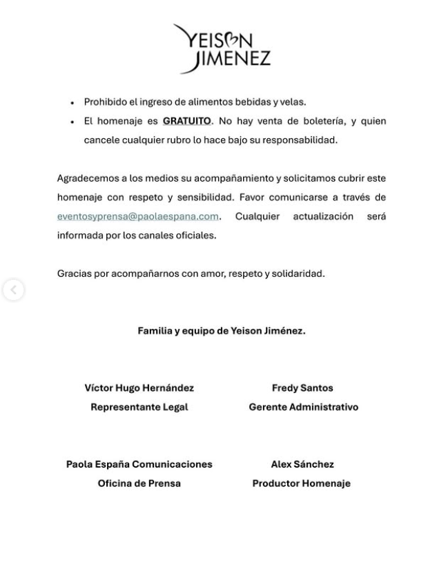 Con este homenaje, colegas, seguidores y familiares rinden tributo a la trayectoria y al legado de Yeison Jiménez, una de las figuras más representativas de la música popular colombiana en la última década.