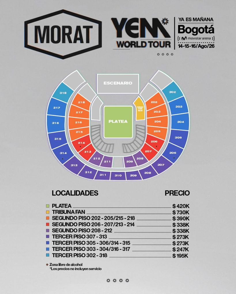 El inicio oficial de la gira será en Bogotá, donde Morat se presentará en el Movistar Arena los días 14, 15 y 16 de agosto de 2026. Estas tres fechas consecutivas buscan repetir el éxito de presentaciones anteriores, en las que la banda logró agotar localidades y consolidarse como uno de los actos pop más convocantes del país.