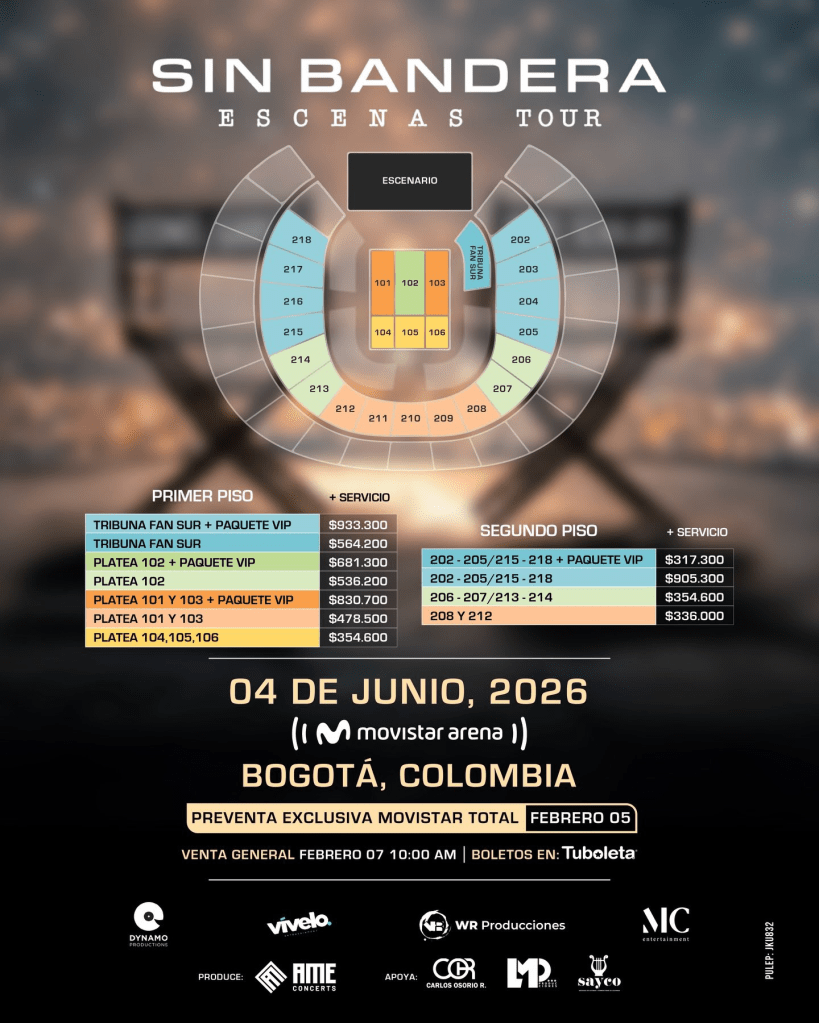 En cuanto a la boletería, la preventa exclusiva para clientes Movistar Total se realizará el 5 de febrero de 2026 desde las 10:00 a. m., a través de TuBoleta, con validación como cliente. La venta general comenzará el 7 de febrero de 2026, también a las 10:00 a. m., por la tiquetera oficial del Movistar Arena.