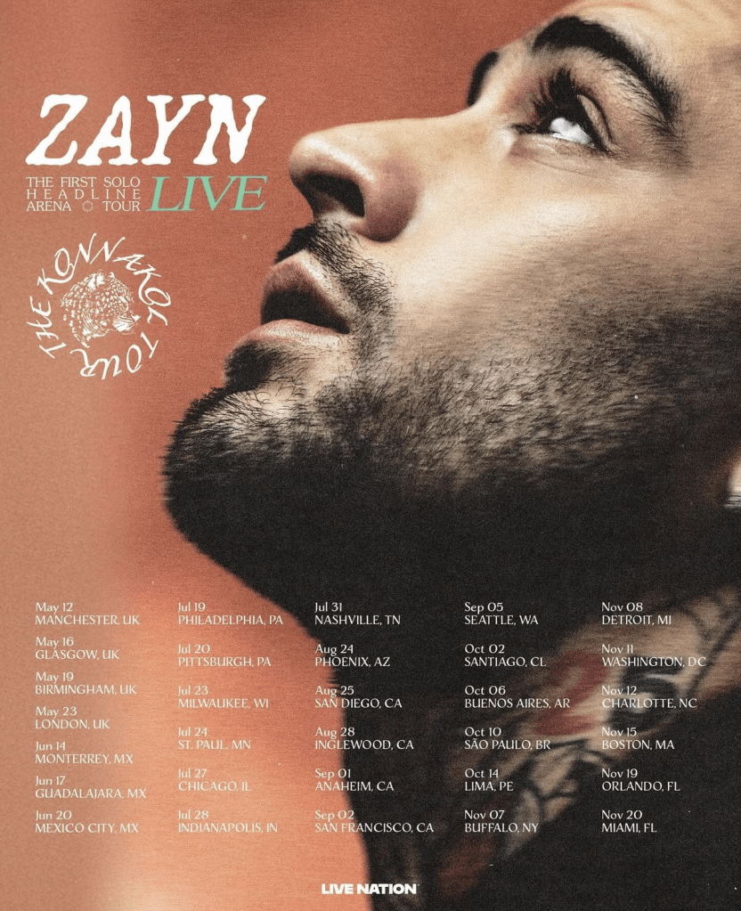 La gira arrancará en mayo en Manchester y recorrerá elReino Unido antes de pasar por México en junio, con presentaciones en Monterrey, Guadalajara y Ciudad de México. En Estados Unidos, Zayn realizará una extensa etapa entre julio y noviembre, con shows en ciudades clave como Philadelphia, Pittsburgh, Chicago, Los Ángeles, San Francisco, Seattle, Washington D.C., Boston y Miami, en arenas de gran capacidad.