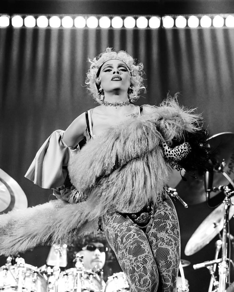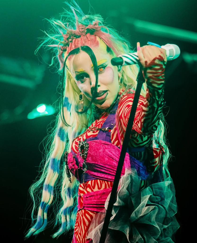 En vivo, el espectáculo está diseñado como una experiencia visual completa. Pantallas LED, animaciones inspiradas en estética futurista y gótica, varios cambios de vestuario y un cuerpo de bailarines que acompaña las secciones coreográficas. El show alterna momentos de baile intenso con otros donde la artista se queda sola en escena priorizando el rap y el contacto directo con el público.