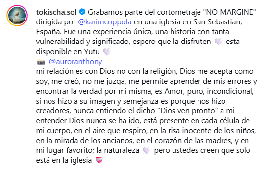 En paralelo, Tokischa se pronunció a través de las publicaciones vinculadas al proyecto “No Margine”, donde defendió el enfoque artístico del cortometraje y su significado personal. La artista aseguró que la obra busca explorar la vulnerabilidad humana y dejó un mensaje centrado en su visión espiritual al afirmar: “Mi relación es con Dios, no con la religión. Dios me acepta como soy, me creó, no me juzga, me permite aprender de mis errores y encontrar la verdad por mí misma”. Sus declaraciones reavivaron el debate sobre los límites entre expresión artística y respeto a espacios de culto.